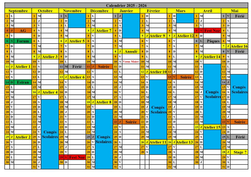 Les ateliers ont lieu de 18H45 à 21H, Salle des Fêtes Olivier Hureau – Rue Jeanne D’arc à La Bernerie, selon le planning ci dessous.